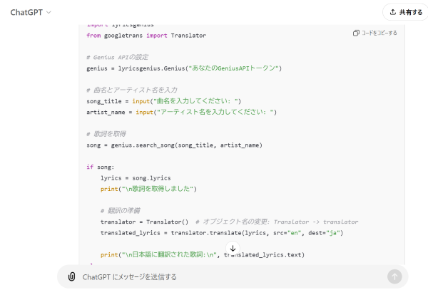 私たちのグループは洋楽を曲名とアーティスト名を入力するだけで翻訳できるプログラム